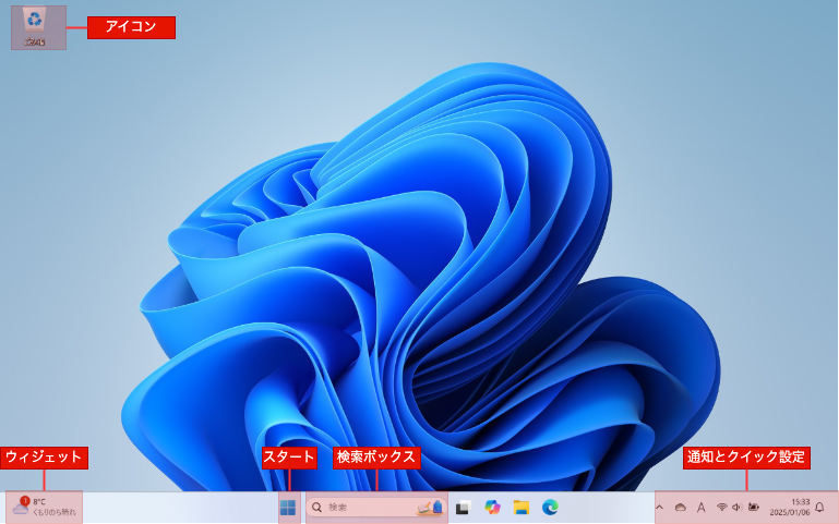 - タスクバー(taskbar): 画面下部に表示されるバー。タスクバーを右クリックし、「タスクバーの設定」をクリックすると、タスクバーの設定を変更できます。