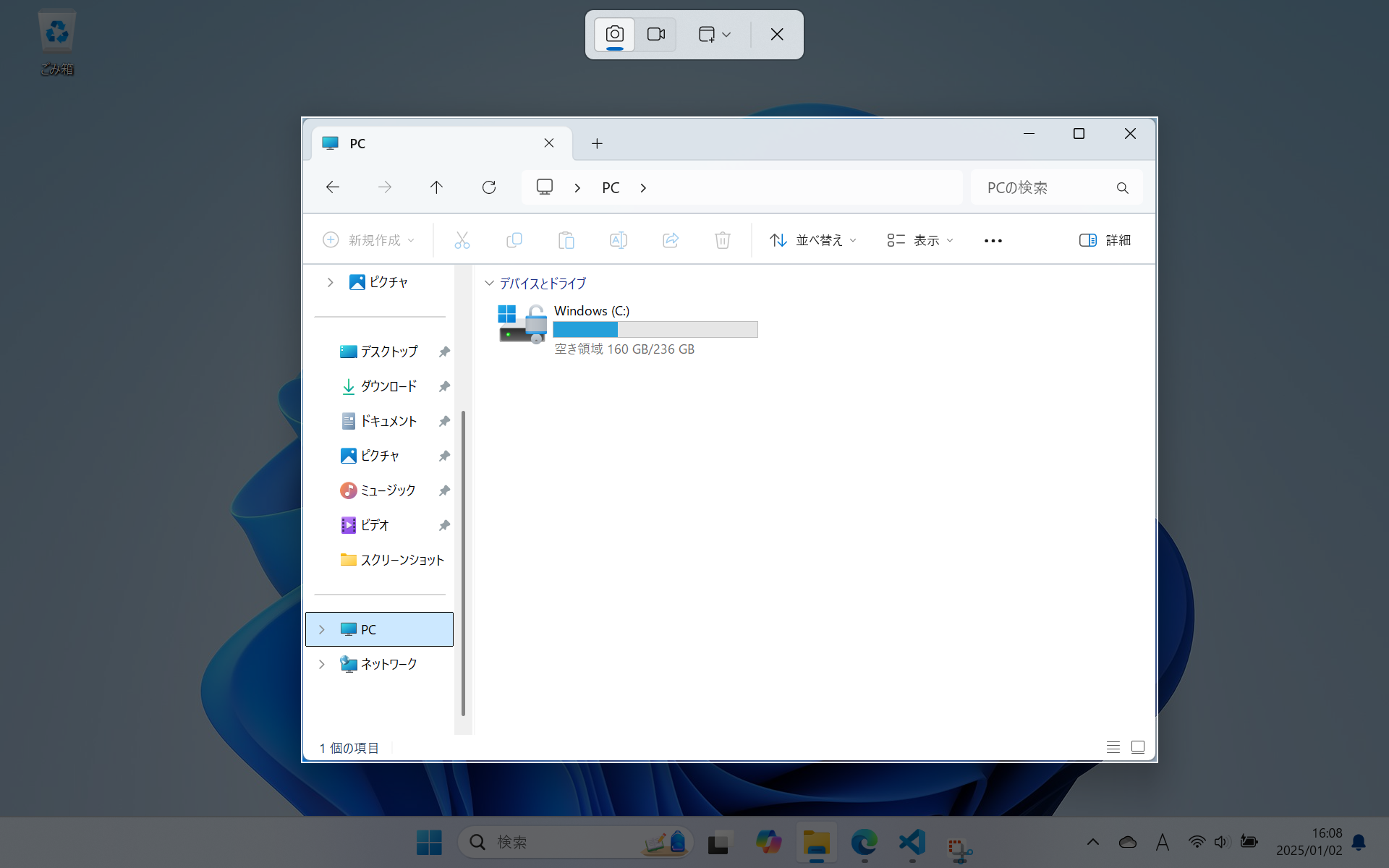 - エクスプローラーのウインドウのスクリーンショットを撮ってみよう。