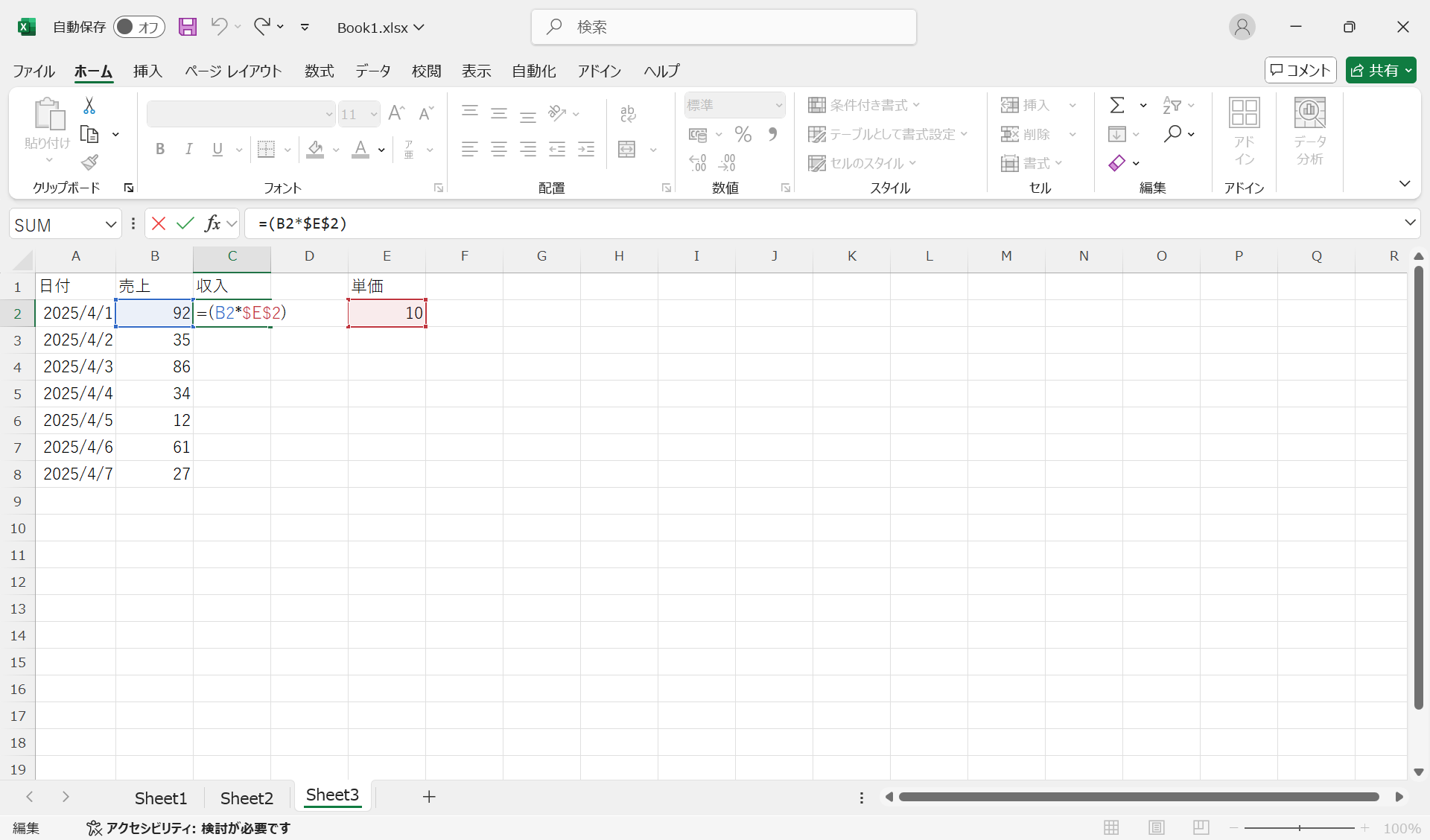 例えば、以下の例では、収入を計算するために、売上*単価を計算します。単価は、E1に入力されているとき、それを絶対参照するために、C2に以下の数式を入力します。