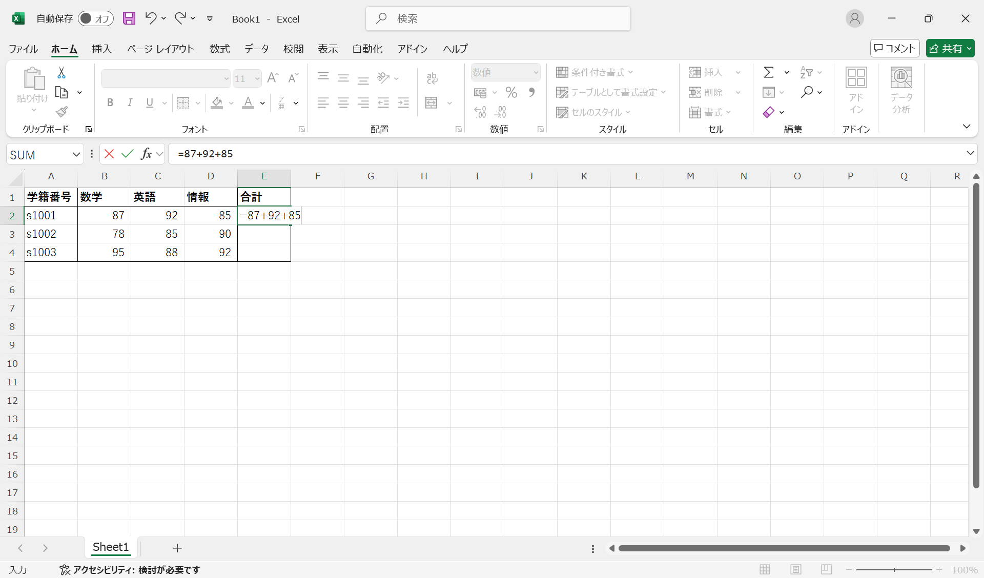 Excelでは、数値の計算を行うために、=で始まる数式を使用します。数式には、+(加算)、-(減算)、*(乗算)、/(除算)などの演算子を使用します。例えば、成績の合計を計算する場合、以下のように入力して、Enterキーを押すと、計算結果が表示されます。