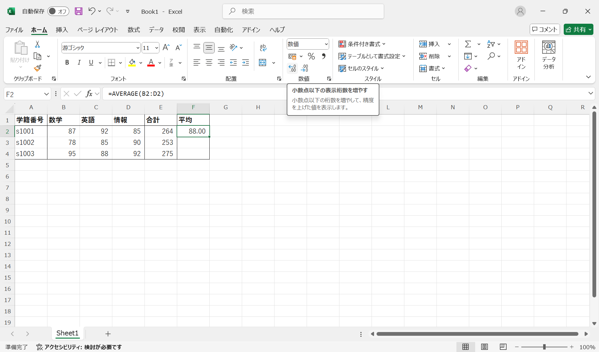 平均値は整数部分で表示されます。小数点以下の値を表示するには、「数値」グループの「小数点以下の表示桁数を増やす」ボタンをクリックします。