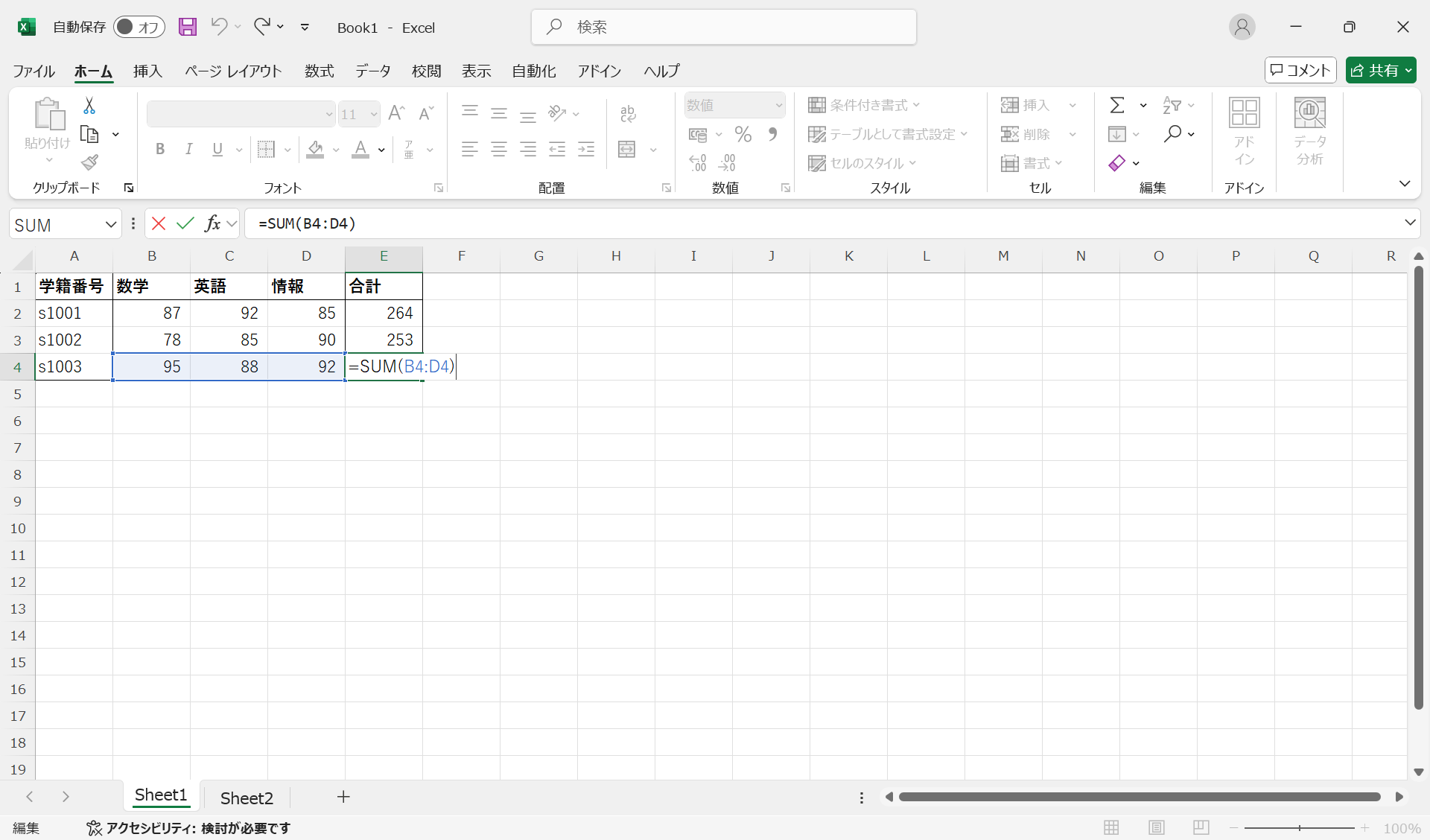 Excelには、さまざまな関数が用意されています。関数を使用することで、複雑な計算を簡単に行うことができます。例えば、合計を計算する場合、SUM関数を使用します。SUM関数は、指定した範囲内の数値を合計するための関数です。以下の数式は、B4からD4の範囲内の数値を合計します。