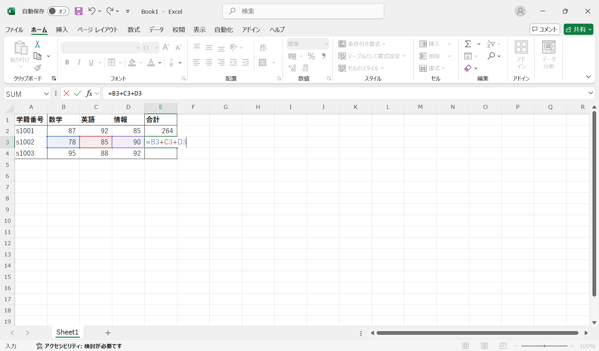 Excelでは、他のセルの値を参照して計算を行うことができます。例えば、数学の成績の合計を計算する場合、以下のように入力します。