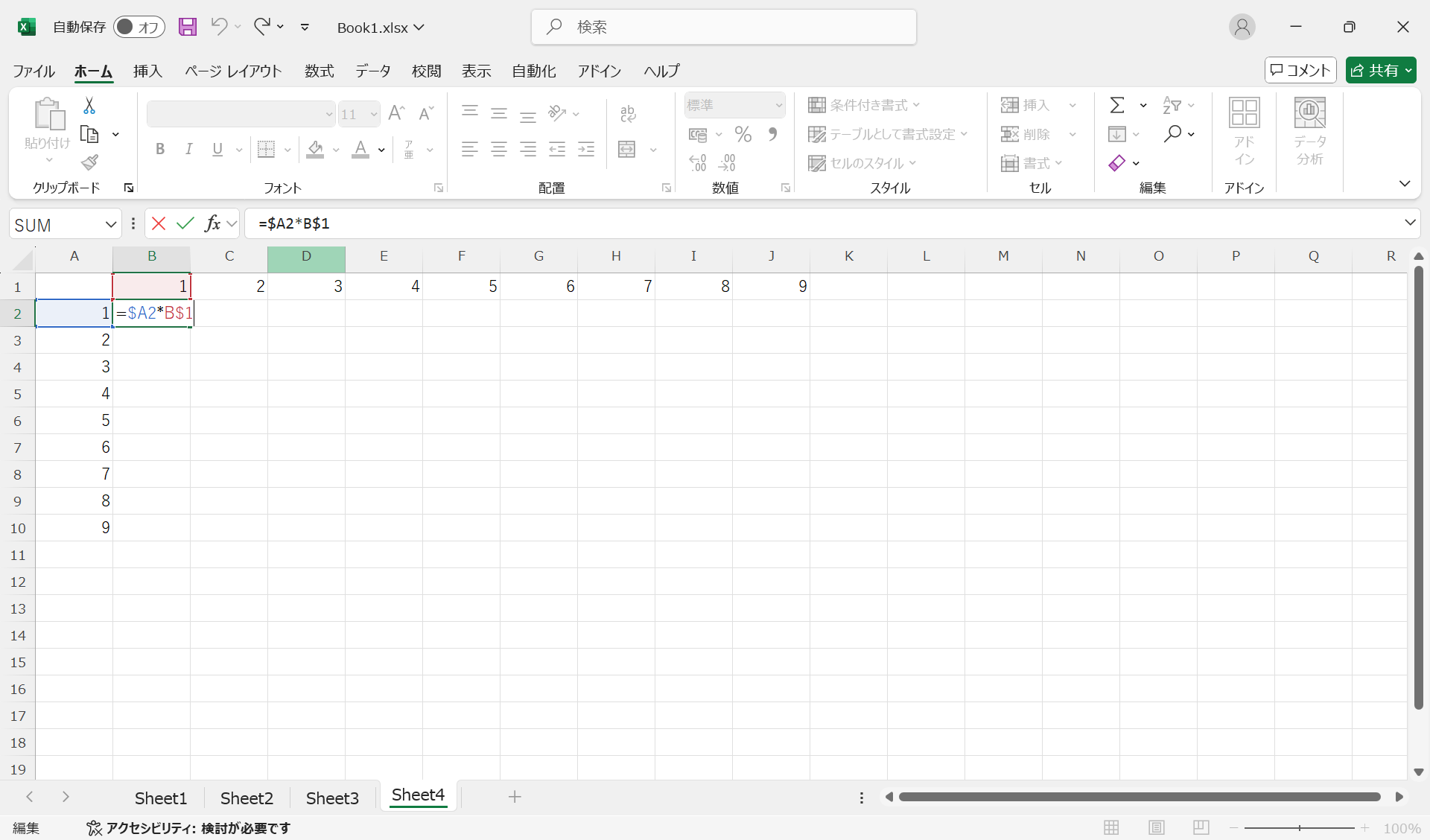 例えば、以下の例では、掛け算の九九を計算するために、$A2とB$1を混合参照します。$A2は、列Aを絶対参照し、行番号は相対参照します。逆に、B$1は、行1を絶対参照し、列番号は相対参照します。