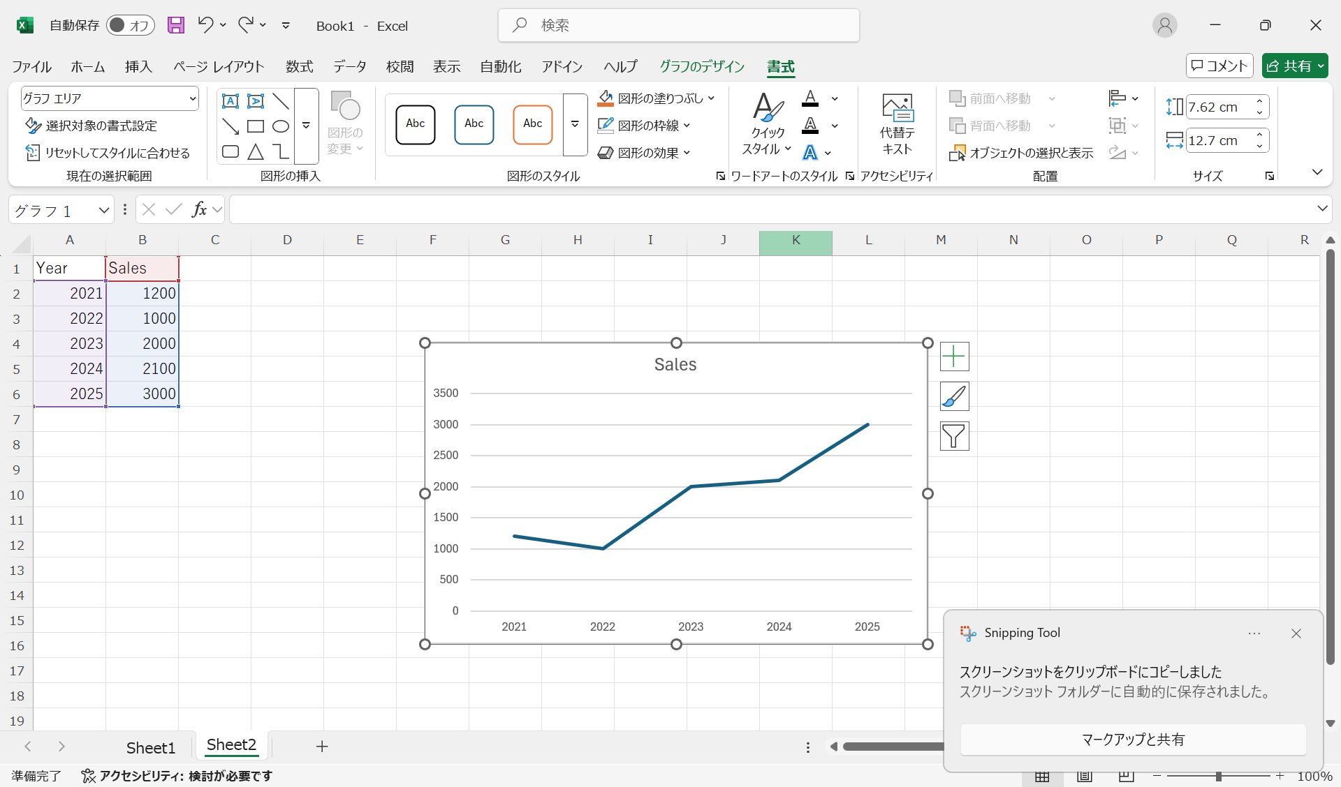 作成したグラフをマウスで選択すると、リボンに「グラフのデザイン」タブと「書式」タブが表示され、グラフの編集が可能になります。