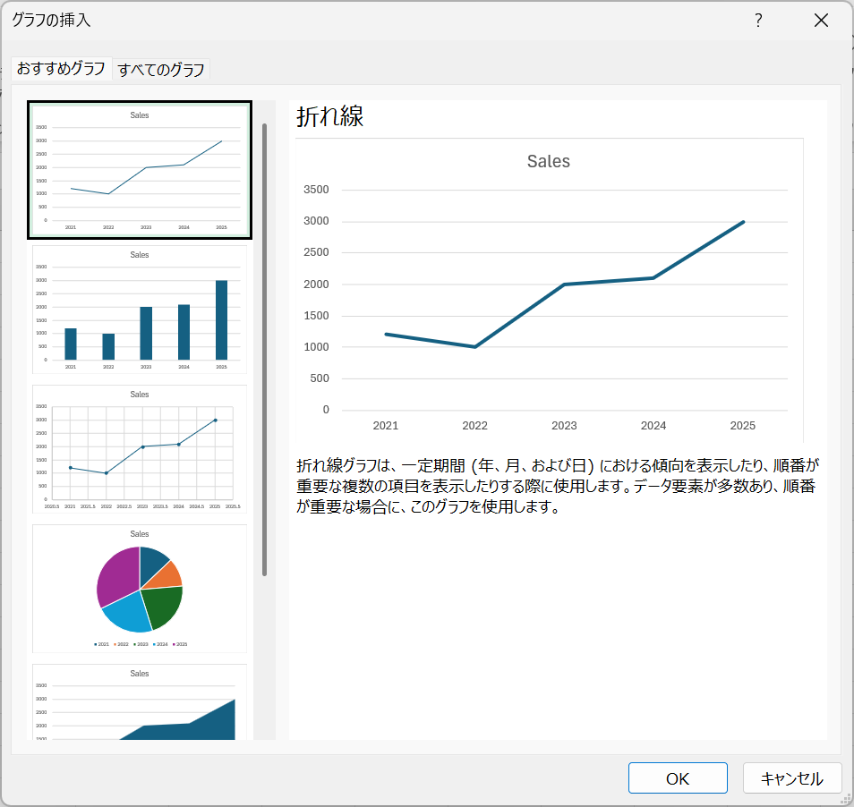 例えば、「折れ線グラフは、一定期間(年、月、および日)における傾向を表示したり、順番が重要な複数の項目を表示したりする際に使用します。」といった説明が表示されます。今回のデータは、年ごとの売上を示しているので、折れ線グラフが適しています。
