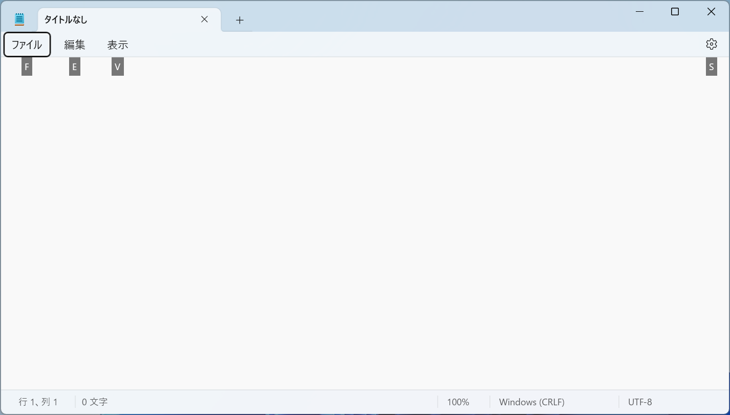 メモ帳でAltキーを押すと、使用可能なアクセスキーのヒントが表示されます。Altとそれを同時に押すと、その機能が実行されます。