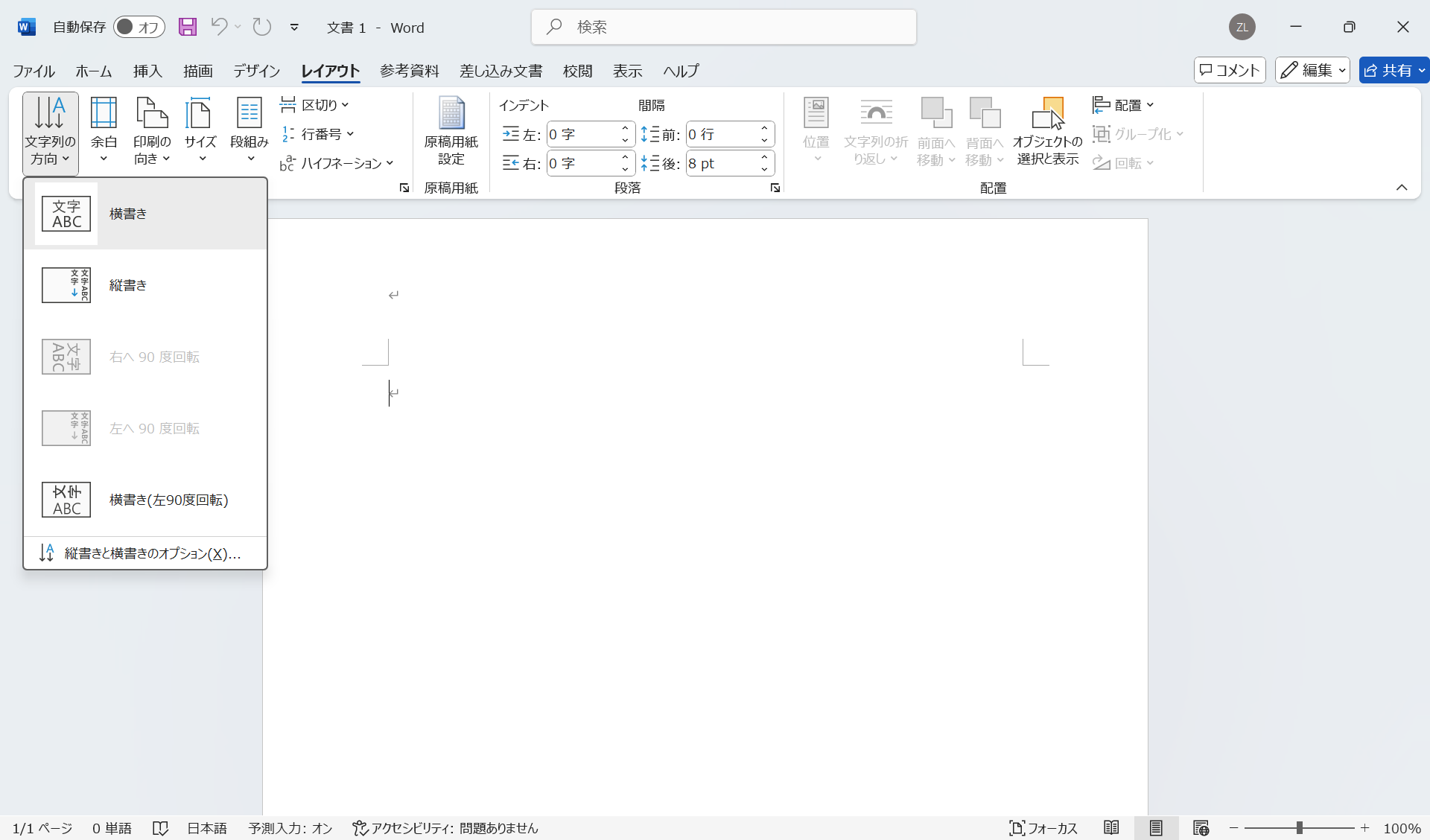 文字列の方向を変更するには、「レイアウト」タブから「ページ設定」グループにある「文字列の方向」を選択します。以下の図のように、「縦」、「横」が選択できます。