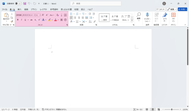 Wordの起動画面で「白紙の文書」を選択すると、以下のような画面が表示されます。