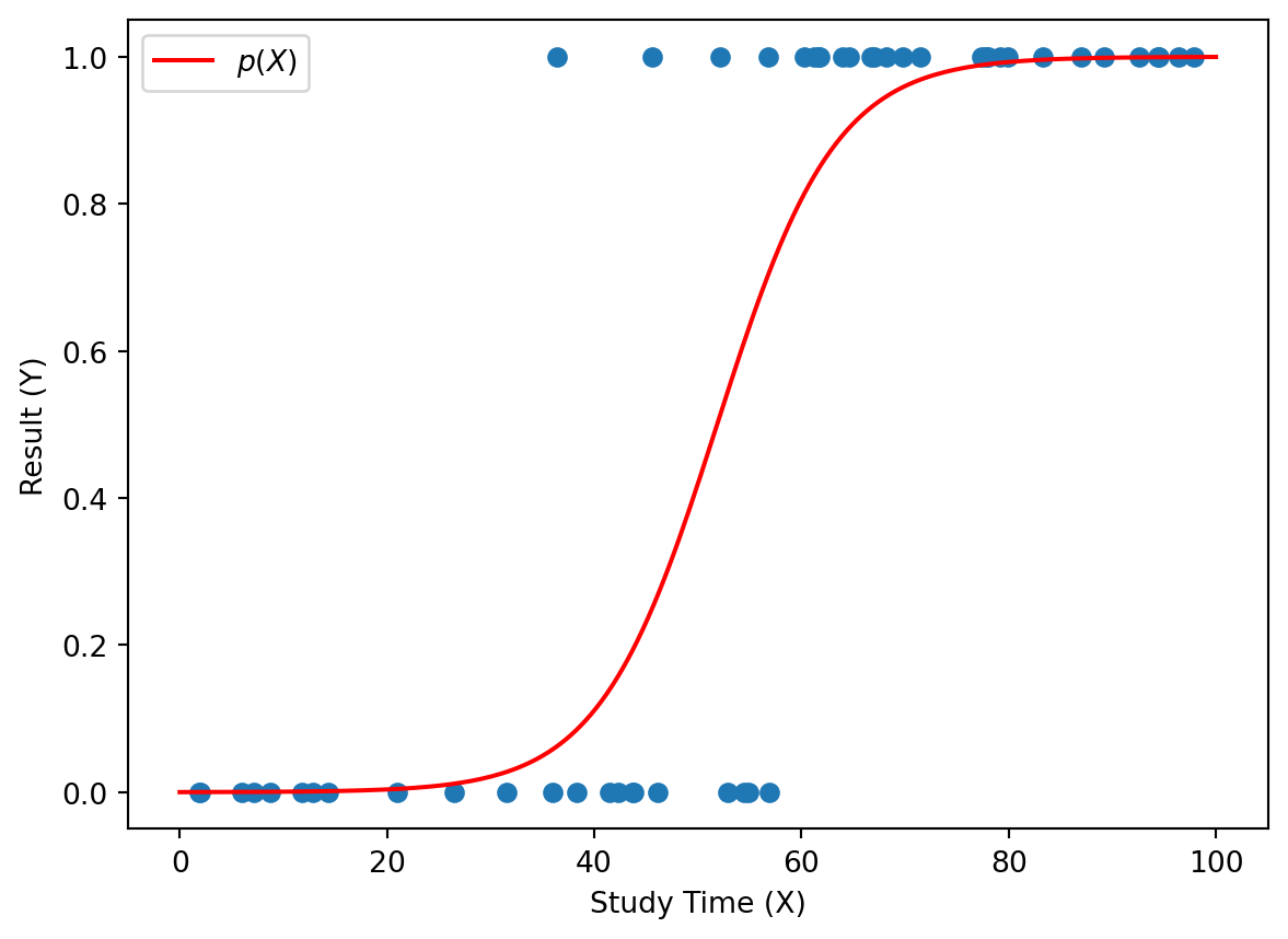 ロジスティック回帰は,説明変数 \(X\) を使って,目的変数 \(Y\) の確率を予測するための手法である。例えば,ある学生が \(X=70\) 時間勉強したときに,その学生が合格する確率は \(P(Y=1|X=70)\) と表される。これ以降,この確率を \(p(X)\) と略記する。