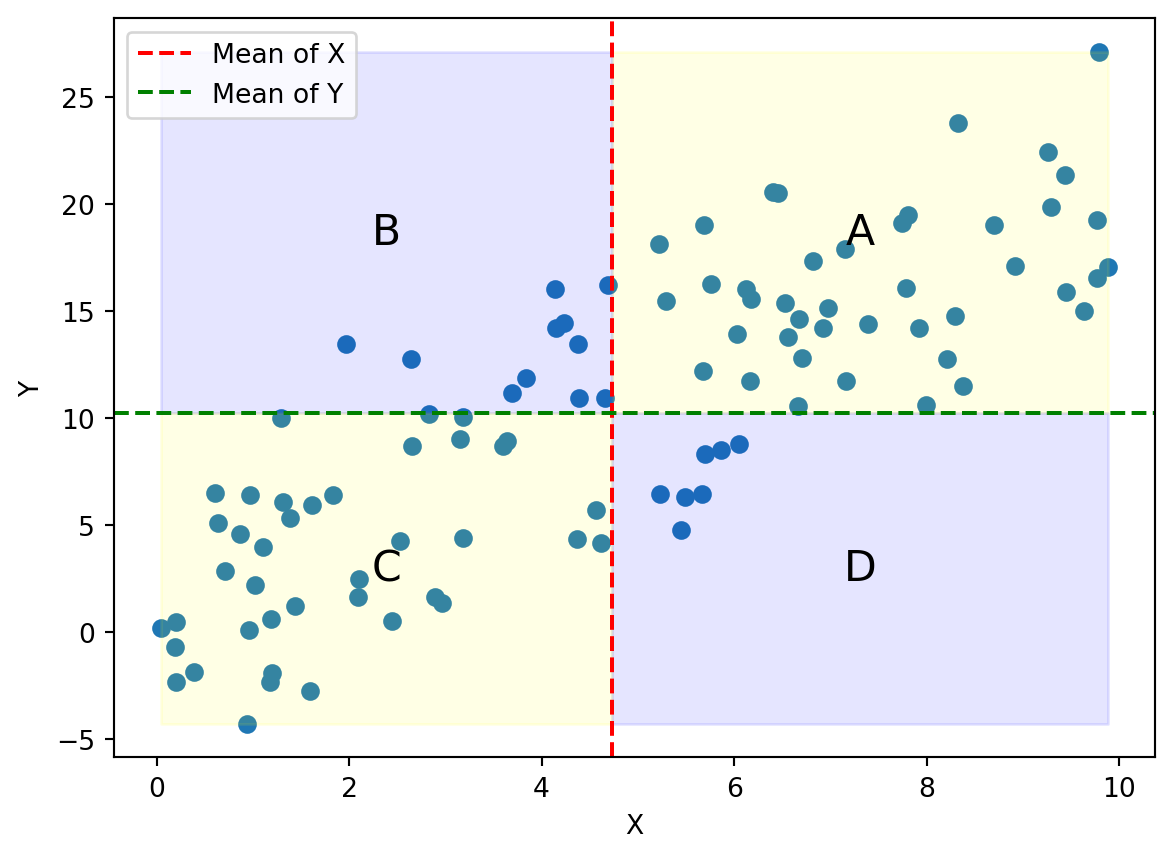 | A | \(x_i > \bar{x}\) | \(y_i > \bar{y}\) | positive |