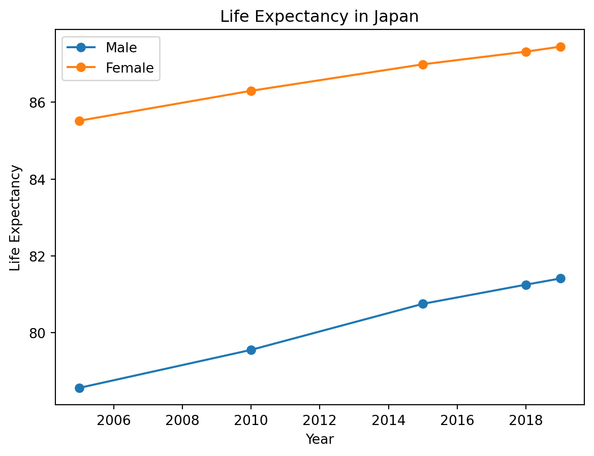 female = [85.52, 86.3, 86.99, 87.32, 87.45]