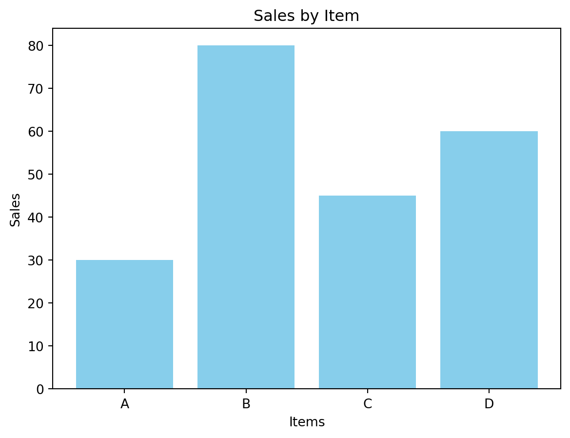 棒グラフ(Bar Chart, or Bar Graph)は、棒の高さで数値を表現する。横軸に項目、縦軸に数値をとり、各項目の値を棒で示す。横棒グラフの場合は、縦軸に項目、横軸に数値をとる。棒グラフは、項目ごとの数値を比較するのに適している。