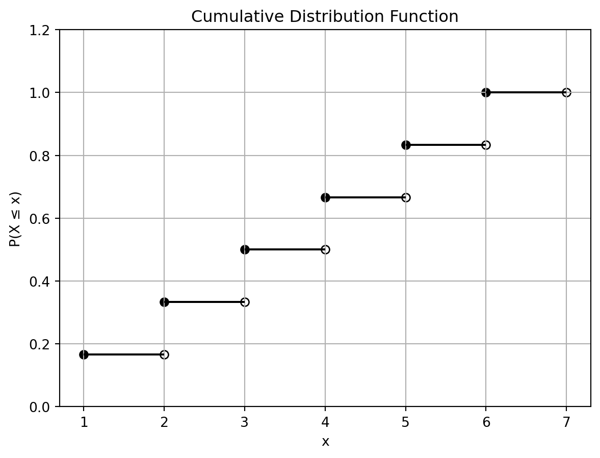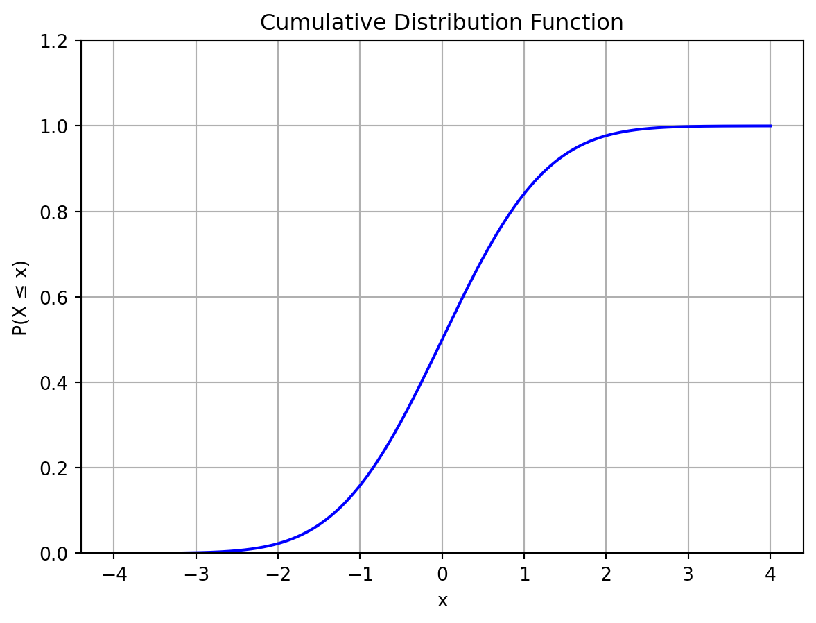累積分布関数 (cumulative distribution function; CDF) は,確率変数が特定の値以下を取る確率を表す関数であり,\(F(x) = P(X \leq x)\) と書く.
