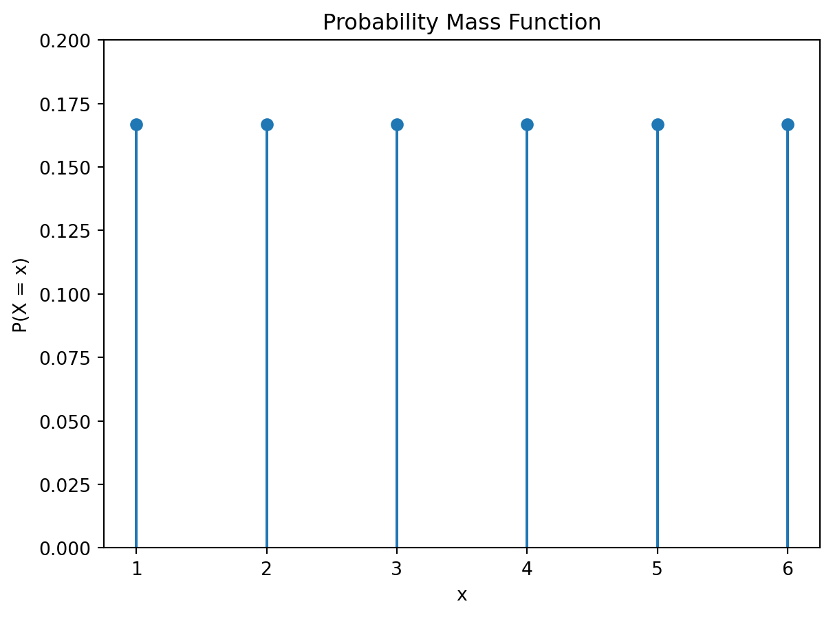 確率質量関数 (probability mass function; PMF) は,離散型確率変数が特定の値を取る確率を表す関数であり,\(f(x) = P(X = x)\) と書く.