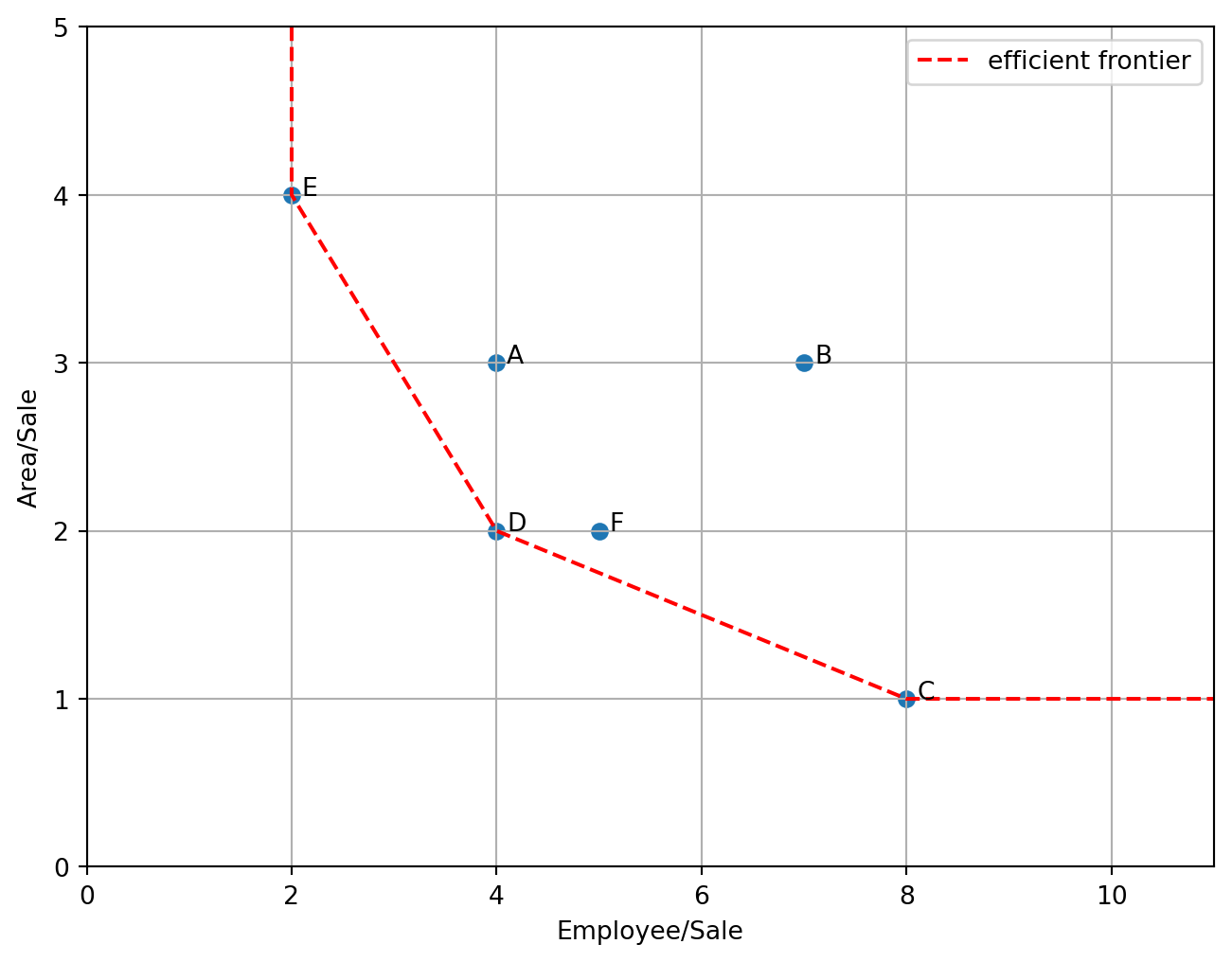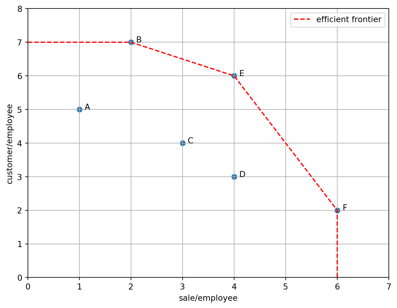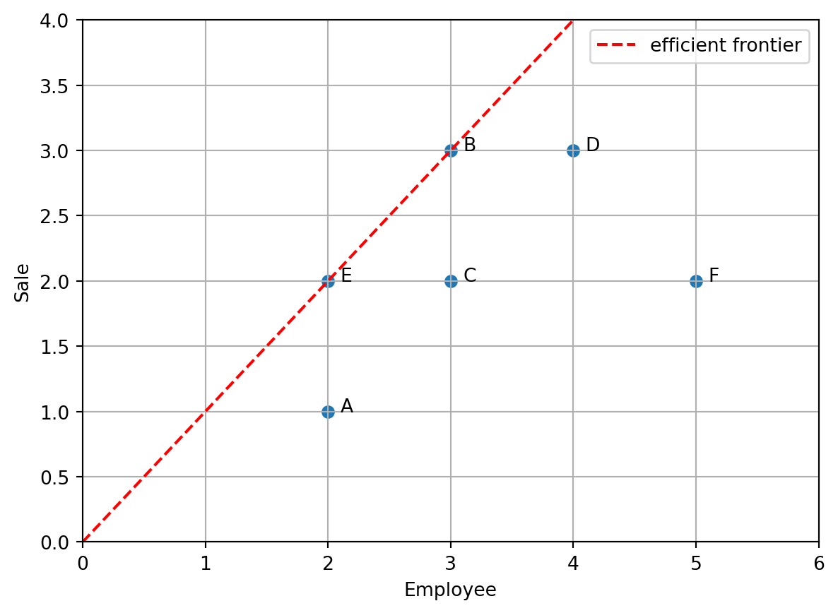 練習 2.1 (1入力1出力) 次の表のような入力と出力が与えられたとき,効率的なDMUを求めよ.効率性を \([0,1]\) の範囲で評価せよ.