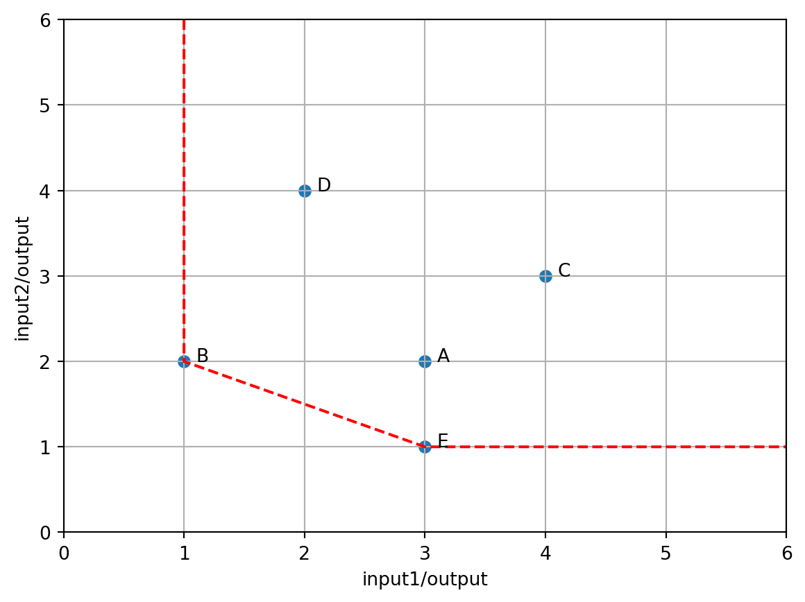 練習 2.2 (2入力1出力) 次の表のような入力と出力が与えられたとき,効率的なDMUを求めよ.