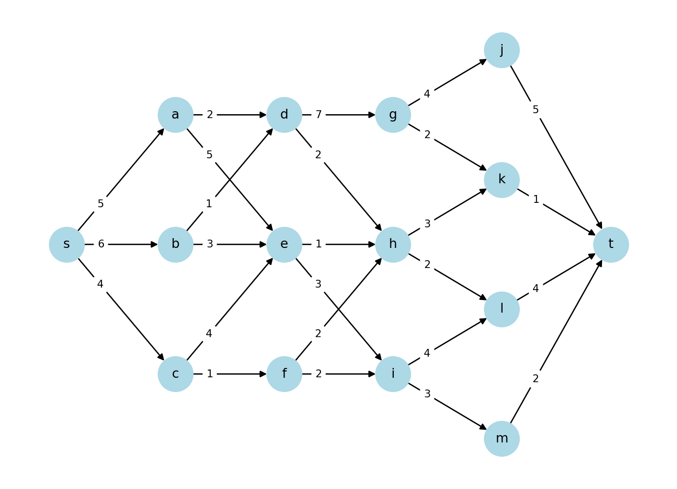 と定義する。始点 \(s\) から始めて,次の点を順にたどることで,最短路 \(P^*\) を構築できる。この問題において,最短路は \(P^* = (s, c, f, h, k, t)\) であり,その長さは 11 である。