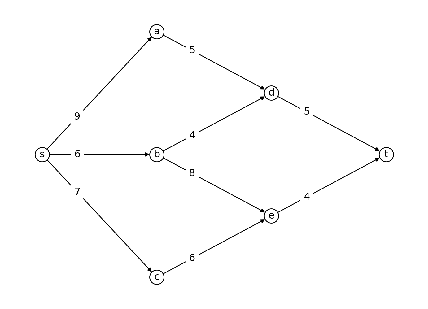 例 11.1 下のグラフにおいて,\(d(a) = 8\) ,\(d(b) = 7\) ,\(d(c) = 7\) が与えられたとき,\(d(s)\) を計算せよ.