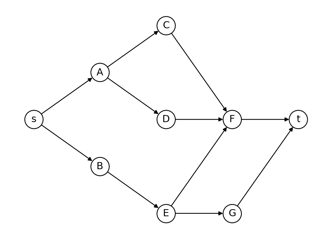 プロジェクト・ネットワークは \(G = (V, E)\) という有向グラフで表される.ここで,\(V\) は始点 \(s\) ,終点 \(t\) と各作業を表す点の集合であり,\(E\) は先行関係を表す辺の集合である.辺 \((v, u) \in E\) では,\(v\) が \(u\) の先行作業であることを意味する.