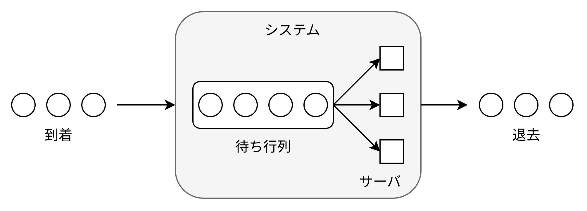 待ち行列システムは待ち行列とサーバから構成される.これ以降は,待ち行列システムを単にシステムと呼ぶことにする.