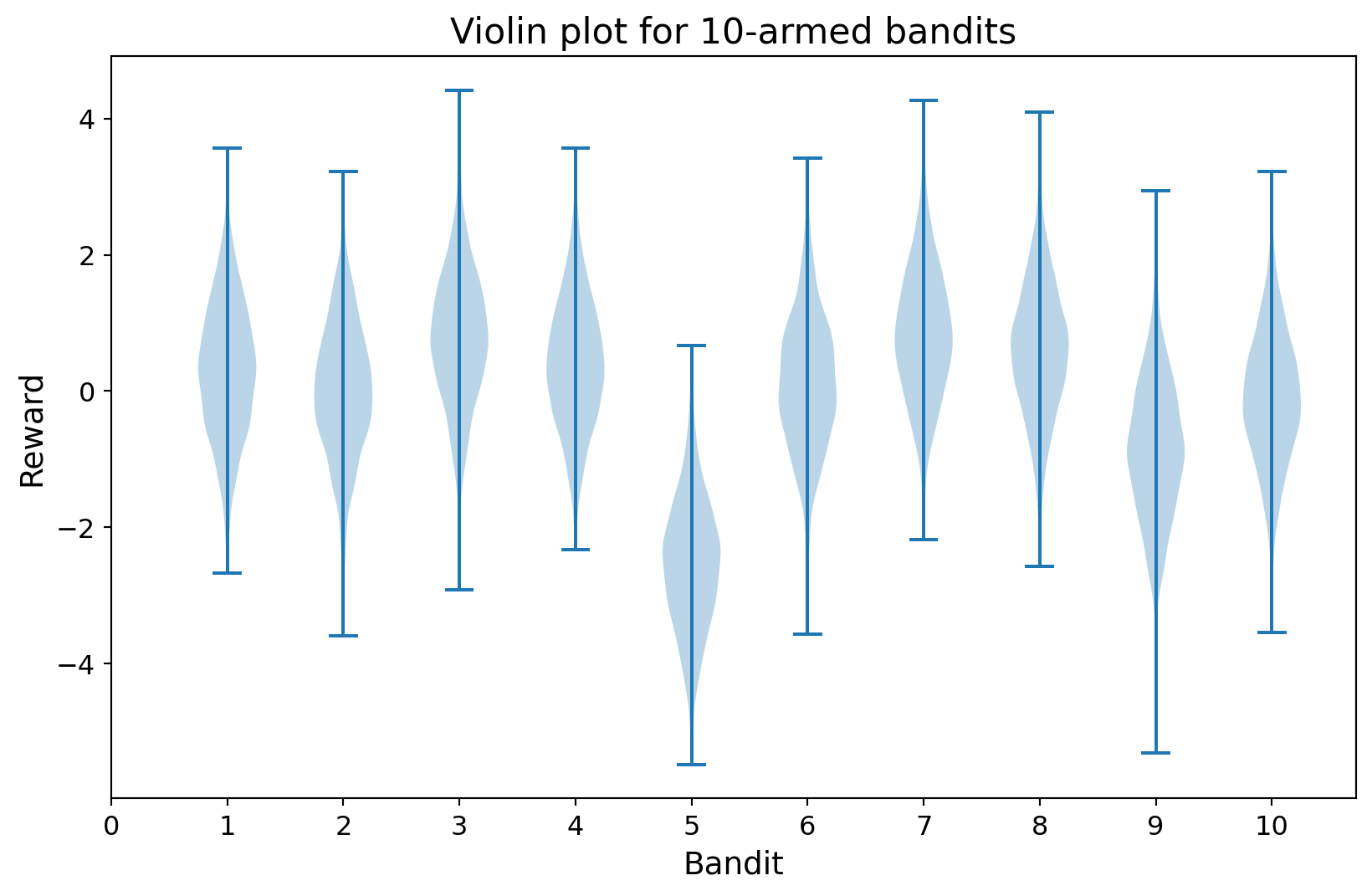 import numpy as npimport matplotlib.pyplot as plt# Set the random seed for reproducibilitynp.random.seed(0)# Set the figure sizeplt.figure(figsize=(10, 6))# Generate the data and plot the violin plotdata = np.random.randn(2000, 10) + np.random.randn(10)plt.violinplot(dataset=data)# Set the labels and title with increased font sizesplt.xlabel("Bandit", fontsize=14)plt.ylabel("Reward", fontsize=14)plt.title("Violin plot for 10-armed bandits", fontsize=16)plt.tick_params(axis="both", which="major", labelsize=12)plt.xticks(np.arange(0, 11))# Save the figureplt.show()