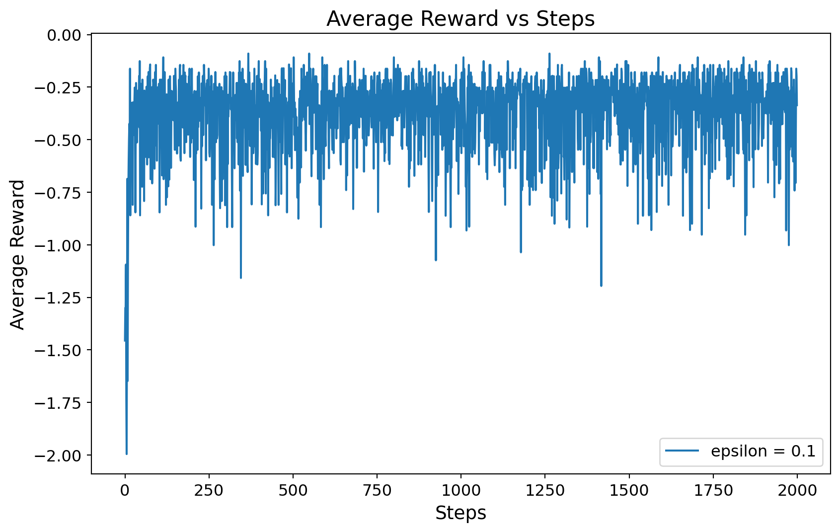 We set the planning horizon steps = 2000. We use the \(\epsilon\)-greedy policy with \(\epsilon = 0.1\). We run the algorithm 10 times by setting number_of_runs = 10 and store the results in the rewards array. Finally, we plot the average reward over time.